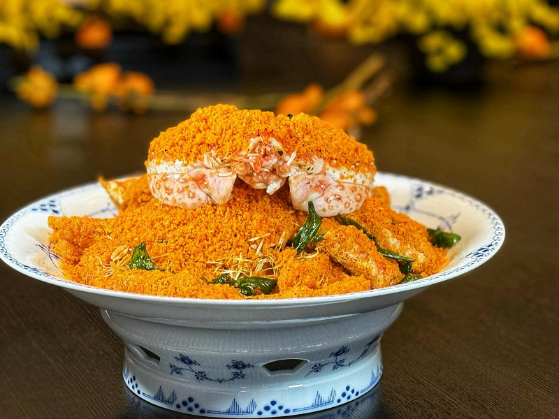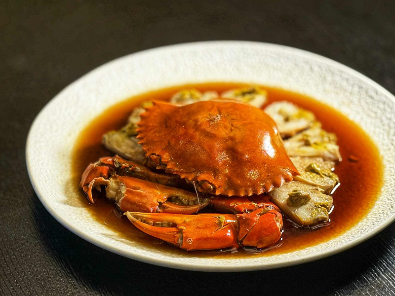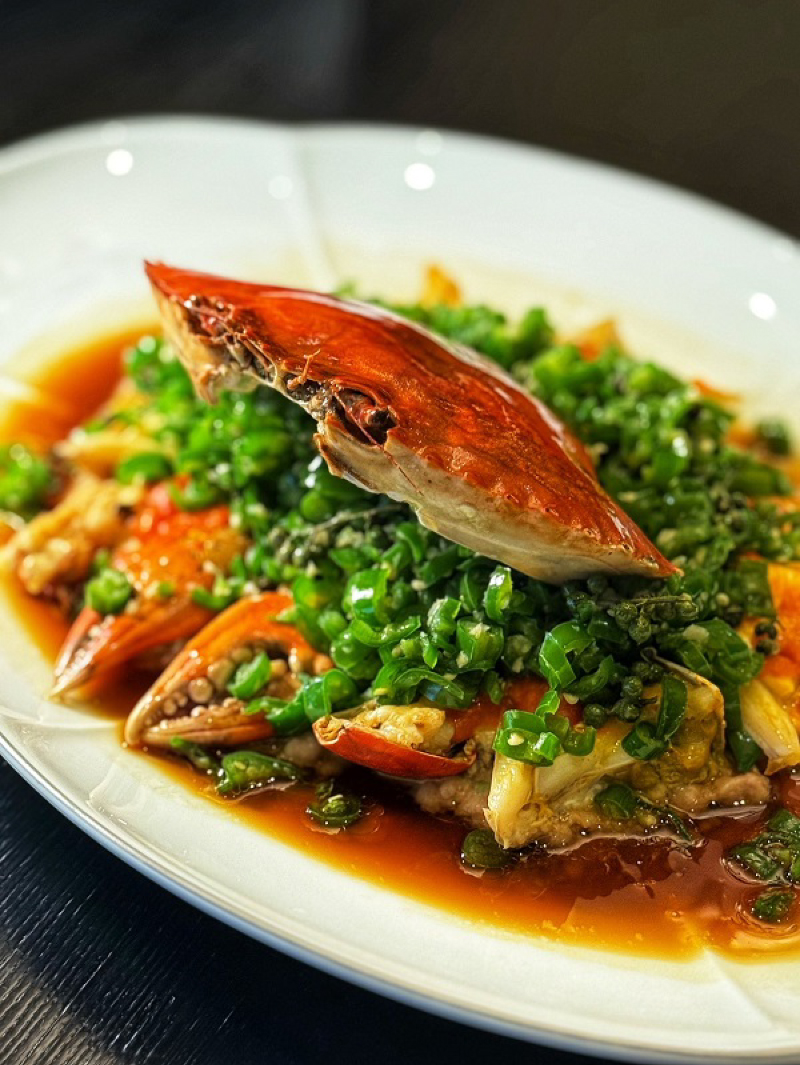 主廚將沙母蟹拆解取其肥美的蟹肉,鋪在豬肉泥基底上,頂層鋪以濃郁濕潤的蟹膏並以大火蒸製,蟹汁精華完美滲入肉餅,出爐後擺上滿滿的青辣藤椒以及淋上特製魚露椒汁,清韻微麻、鮮香層層綻放。
