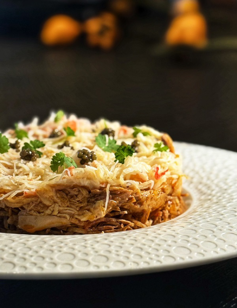 酥脆炸至金黃的芋頭絲、Q彈雞腿肉與鮮嫩松葉蟹肉層層堆疊,上桌前點綴魚子醬與食用花,並佐以紅油與煳辣油調製的過橋醬汁(蘸醬)。入口即感受芋絲的酥脆、雞腿的彈嫩與蟹肉的鮮甜交織,紅油與煳辣油微微香辣,香氣奔放而不搶食材本味,讓傳統川味與海鮮鮮甜巧妙融合,呈現創新與經典的完美平衡。