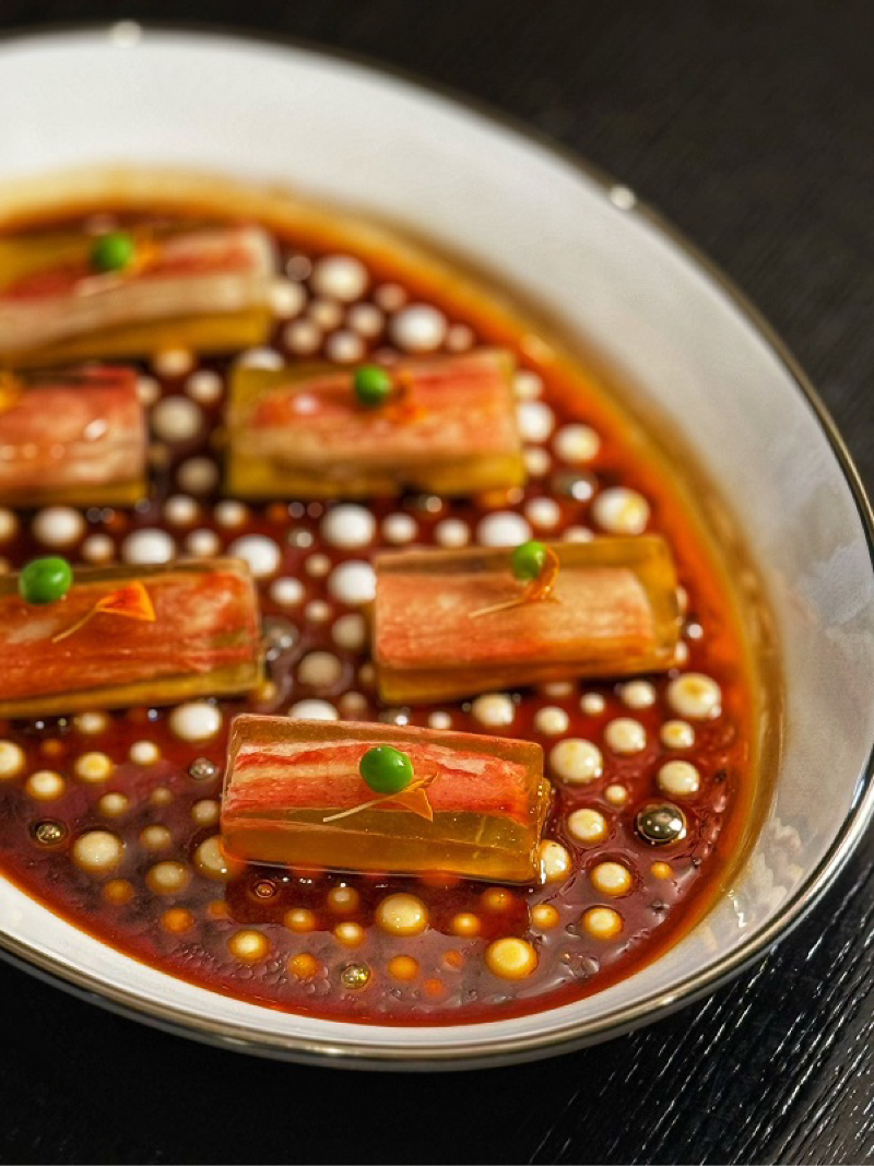 至於美味也無庸置疑,取活體松葉蟹最鮮甜的蟹腿肉和清湯凝成晶瑩蟹肉凍,將肉汁精華牢牢鎖住,另以老醋、花椒與紅油調成特製酸辣醬汁,每口鮮甜與酸辣交錯,增加味覺沖擊感,既保留海味原香,也展現川味的麻酸層次。