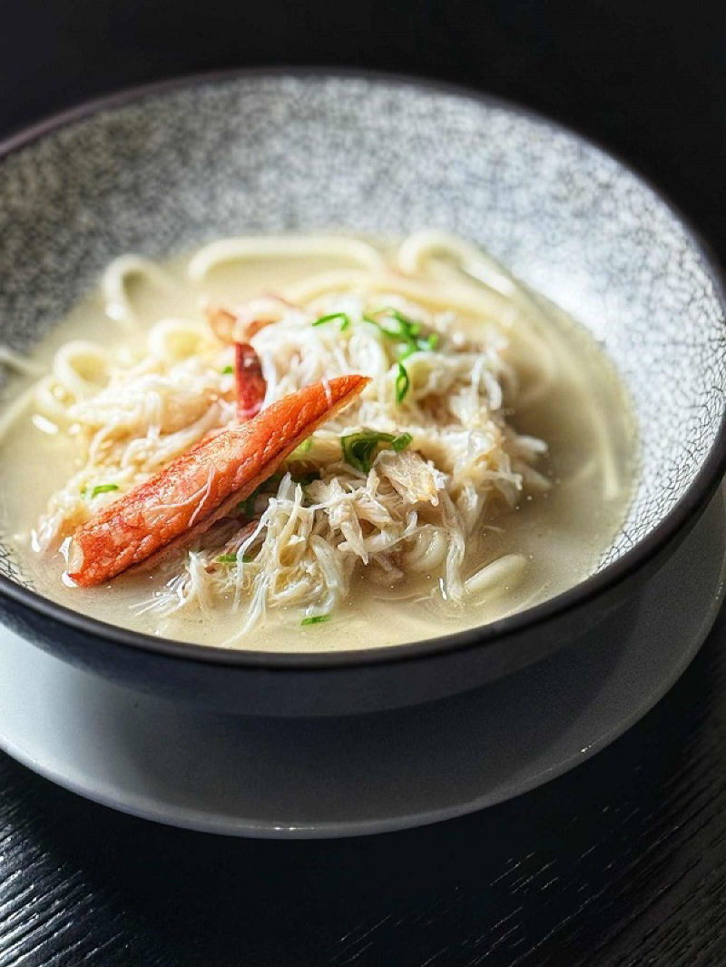 松葉蟹肉麵以老母雞、雞骨及豬大骨慢火熬製,反覆沖煮至湯頭濃白醇厚,將蝦仁丁與火腿絲煸炒至香氣四溢,再注入白湯與手工麵條,讓每根麵條充分吸附湯汁精華後撈出置於碗中,並鋪上每份至少半斤的現拆松葉蟹肉,蟹肉鮮香細嫩、入口溫潤滑順。