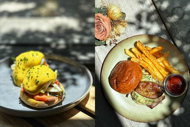 白日慢嚐選用好食材不手軟,圖左為鮭魚班尼迪克蛋,圖右為經典牛肉漢堡加鴨肝。(圖片來源:Sid)