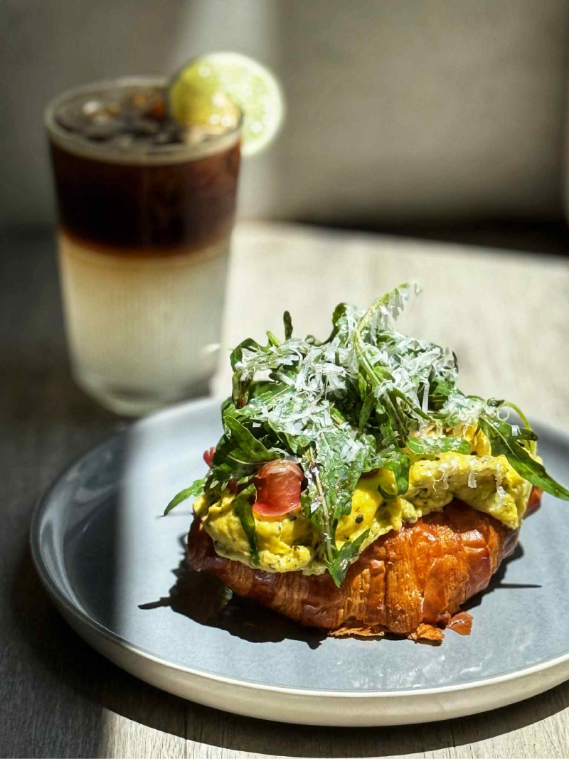 「松露炒蛋伊比利火腿可頌」將歐洲幾個最具代表性的風味,用適合早午餐的形式堆疊組合起來,以傳統法式炒蛋的工法,加入鮮奶油、起司讓蛋液能夠維持滑嫩質地,並拌入松露醬及松露油,讓松露的香氣隨熱氣溫柔散發。西班牙伊比利火腿帶有獨特榛果香、油脂的鹹鮮味,再加上新鮮芝麻葉、巴薩米克醋、現刨陳年帕馬森起司,與大可頌堆疊出更多味覺及口感層次。