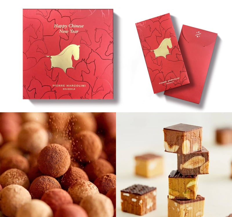 即日起馬年臻禮任兩件禮盒即享9折優惠,消費滿3,000元即贈小確幸5入禮盒(可累贈),期間內(1/19-2/28)消費滿5,000元,加贈 「駿躍新程」限量馬年紅包袋(贈完為止)。(圖片來源:Pierre Marcolini)