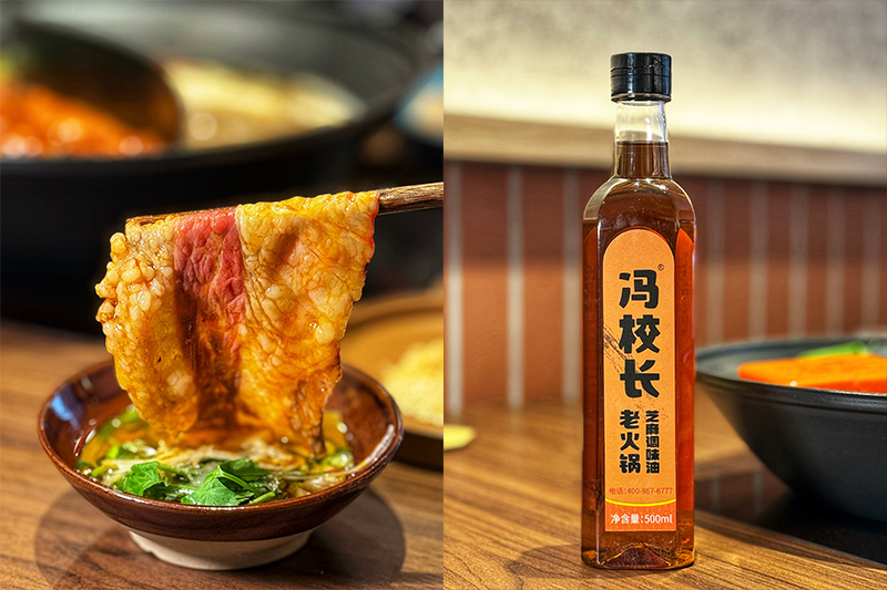 「馮校長老火鍋」湯頭的美味關鍵在於複雜的香料配方以及獨家炒製手法。特別選用每年10月至隔年3月開始吃乾草的牛隻牛油為底,搭佐正宗郫縣豆瓣醬,以及內黃新一代頂級朝天椒的辣、貴州二荊條的香氣,還有生長於海拔2,000~2,500公尺的漢源花椒的麻,以及多種辛香料,共同交融成獨一無二的芬香鍋底。上桌時再加上滿天星、子彈頭、花椒增添層次,造就出「麻而不燥、辣而不嗆」的迷人風味。