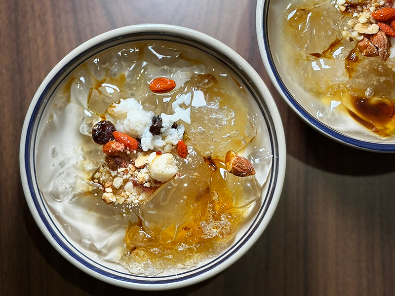 餐後別忘了點一份「成都冰粉」(80元)!晶瑩剔透的冰粉淋上黑糖與紅糖漿,再加入酒釀提味,鋪上葡萄乾、蔓越莓乾、綜合堅果與山楂碎,酸甜交織、清爽不膩,是一道專為為剛吃完麻辣鍋後的味蕾帶來暢快的完美甜點!