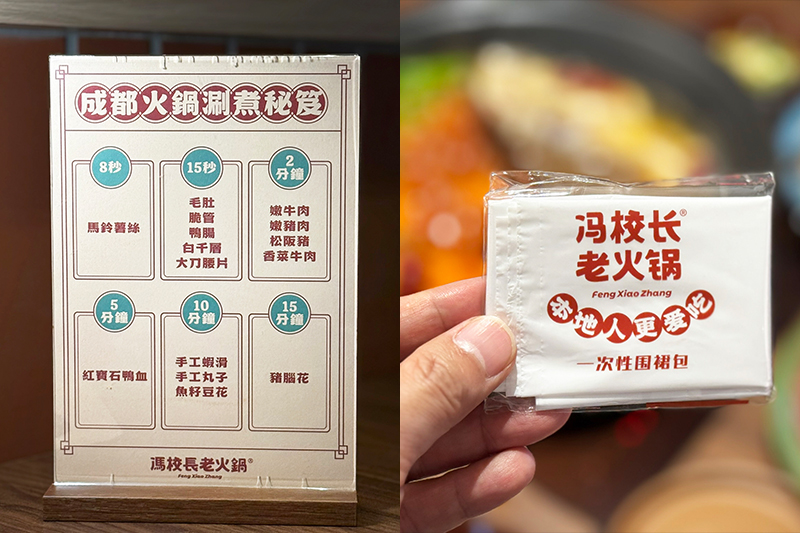 馮校長老火鍋提供各式食材的最佳涮煮時間參考,另外也會提供一次性圍裙包。(圖片來源:Sid)