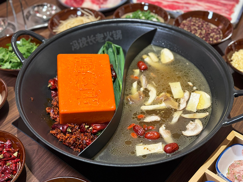 也正因為這份對味道的執著,加上創辦人馮明強對餐飲市場的敏銳觀察,他以「做本地人更愛的火鍋」、「開一家比對面都好吃的火鍋店」為目標,2023年3月於成都核心商圈太古里開出第一家「馮校長老火鍋」,一開幕便掀起全國級話題,不僅創下「日均翻桌 15輪」、「候位5小時」的驚人紀錄,更一躍成為饕客口中的「成都火鍋排隊王」,短短幾年間,門店數快速突破400間,版圖更拓展至美國、新加坡等地,地道川味飄香海外,連黃仁勳也曾指名朝聖,讓這鍋麻辣再添一筆傳奇色彩。