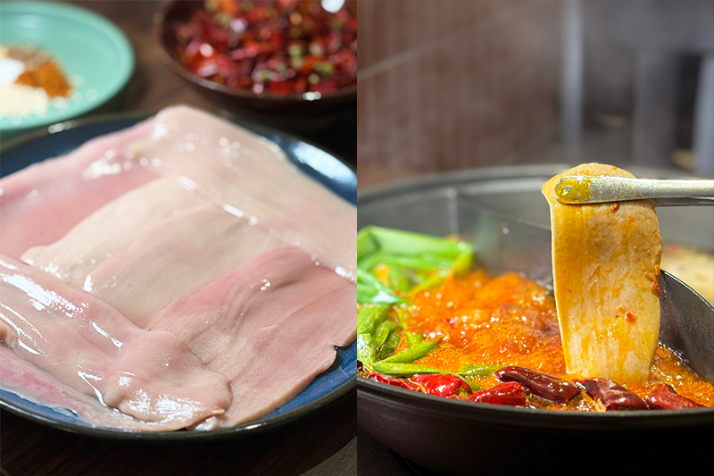 店內主打的「重菜品」陣容也不容錯過!其中又以手工紅寶石鴨血、大刀腰片與菊花郡肝最具代表性,以獨門工法製成的「紅寶石鴨血」,質地如果凍般滑嫩,吸飽紅湯後入口即化,每一口都是麻辣精華;外形與你我熟悉不同的「大刀腰片」(280元),嚴選新鮮豬腰快切成每片厚約0.2公分的薄片,下鍋數秒即熟,口感爽脆、不帶腥味,是內行饕客公認的必點招牌;而視覺感十足的「菊花郡肝」(280元),則將鴨胗透過繁複刀工處理,入鍋5分鐘後宛如花朵綻放,不只好吃,也為整桌增添話題亮點。