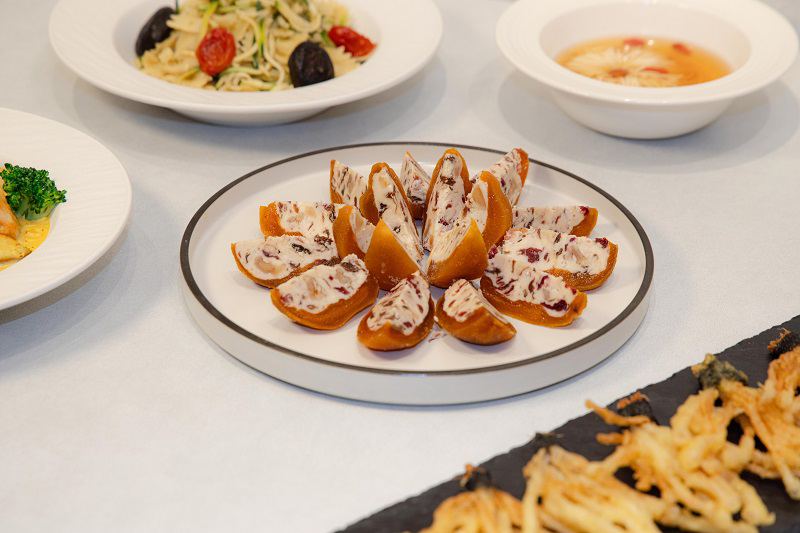「金針酥扇」則把新鮮金針菇排列成扇形後,酥炸至金黃酥脆,外觀如花朵盛開,口感輕盈爽脆,香酥迷人。「菊花豆腐」選用細緻嫩豆腐,主廚刻製成菊花造型,花朵於湯中盛開,搭配枸杞增添鮮美滋味。餐後可品嘗限定甜點「甜柿乳酪捲」,新竹在地甜柿細膩融合綿密奶酪,口感層次豐富,甜而不膩,為味蕾帶來極致的優雅享受,於假日下午餐供應。