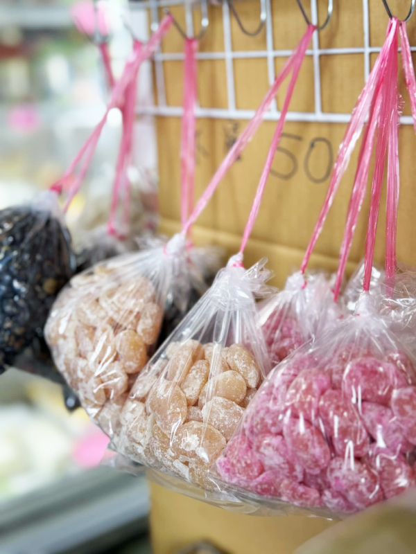 長條狀的零嘴再加一!外觀黃白色的「冬瓜條」,顧名思義是由冬瓜所製作,去皮切條的冬瓜需加入小蘇打鹽滷,再加入砂糖、裹上糖粉,可以品嚐到冬瓜清甜的口味,有著甜蜜生子的喜氣寓意。