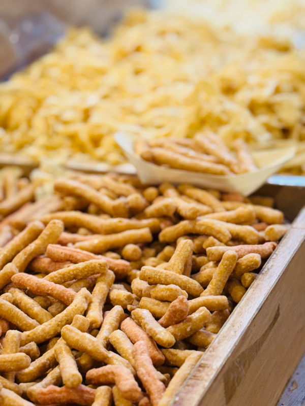 一條長長像手指、看起來像餅乾、吃起來甜甜的,這個零嘴叫做「寸棗」!寸棗也有人稱為春棗、棗枝,傳統做法是以糯米粉為原料,油炸成短短的長條狀,再裹上糖漿製造甜味。入口酥脆、有香甜味,常常一吃就停不下來。據說以前戰亂的時候因為紅棗稀缺,大家曾經一度以寸棗做替代品來款待客人。寸棗有早生貴子、年年好的寓意,替新春期間添福氣。