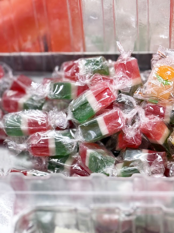 綠色、紅色在兩邊,中間有一條白白的,是軟軟的糖果,這款「三色軟糖」也是過年糖果盒裡的釘子戶,每年都在!三色糖果是用砂糖、麥芽糖、洋菜粉和食用色素等製作的甜食,據說是日據時期由日本傳來台灣,滋味香甜軟Q。紅色、綠色分別代表喜氣、生機等寓意,三層相疊的造型則有家族團結、生活美滿的象徵。
