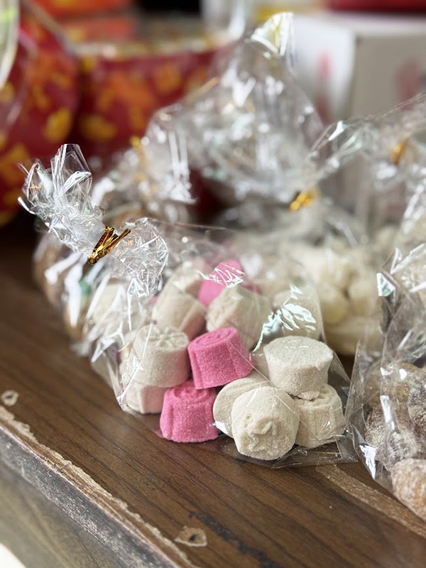 還有這款一樣主打粉紅色、白色的小巧糕點,名字是「糕仔粒」。據說,糕仔粒以糕粉製作成精巧的粒狀,是為了營造像金碎銀子的樣子,紅白兩色則是口袋裡的金銀財富。吃一口,嘴巴裡有鹹梅子、綠豆粉的味道,甜鹹風味、鬆軟好入口。年節間吃糕仔粒,還有祝福步步高升的吉祥寓意。
