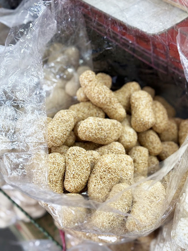 最後這一款零嘴「麻荖」大家應該就比較熟悉了,以芋頭粉、糯米粉製作油炸的麻荖淋上麥芽糖之後,依照口味會裹上花生粉、芝麻等食材,外脆內酥香,有「吃麻荖吃到老」長壽健康的寓意。