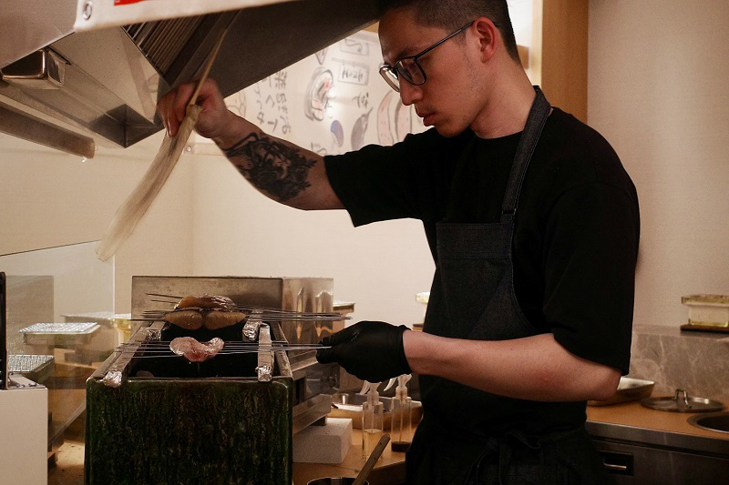 年僅30歲,在米其林二星餐廳「祥雲龍吟」、「盈科」跟著稗田良平主廚修業,「朝炭」的主廚余沁儒(Eden)過去的上班時間都以晚上居多,他笑稱來到「朝炭」上班都需要校正回歸時間,上午十點開始營業,但主廚Eden其實每天早上得提早兩小時到店鋪燒炭。