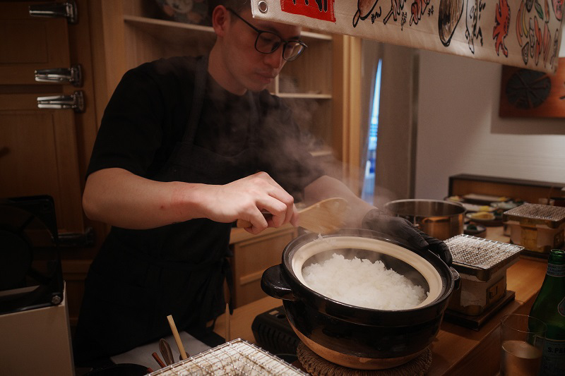 日式定食不能缺少的靈魂白飯與味噌湯,是「朝炭」在烤魚之外的另一項講究。談及必須認真對待的白飯,Eden在試過不同米種後,選擇了日本七星米、魚津米1:1比例混合炊煮,而煮飯水也改變松山區的水質,調整為更接近日本關西地區偏軟水的口感。在釜鍋裡炊煮出的米飯,帶有七星米的甘甜、魚津米的飽滿圓潤,能襯托出烤魚的油脂,以及其他配菜的不同滋味,是作為定食裡的最稱職配角。