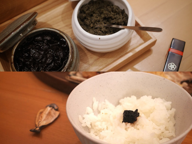 套餐之外,桌旁可自由取用的海苔醬、大葉胡椒也不能錯過,這是能讓米飯再度追加的白飯殺手。Eden以香菇高湯製作海苔醬基底,讓兩種不能的旨味代表結合出更深層的風味,而海苔也以高級壽司店必備的林屋海苔製作,「海苔以手撕再熬煮,不是用機器打的」,Eden選擇用比較麻煩的工序,他笑著說這都是—「情懷。」