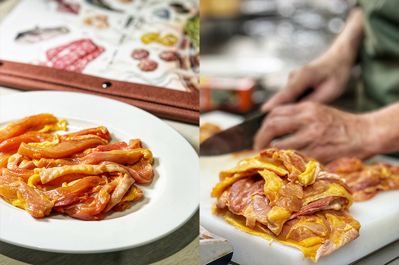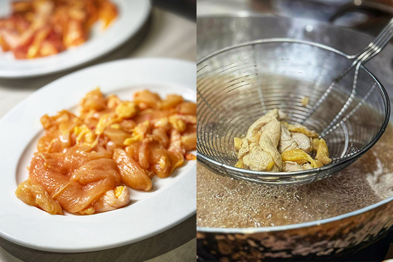 享用雞腿與雞胸時,不要將肉品直接入鍋煮熟食用,此舉會讓肉質變柴。溫體玉米雞保水度高,加上切的厚薄度適中,陳易松建議用涮煮的方式。