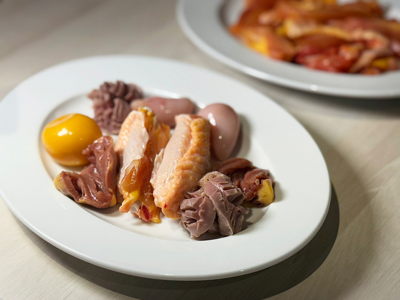 全雞套餐除了有一鍋原味上湯,另會附上西式下午茶常見的三層架,有二盤雞胸肉、二盤雞腿肉,最讓人驚豔的是第一層的內臟拼盤,包含雞心、雞胗,還有公雞才有的雞胇,以及極為稀少、母雞才有的「提燈」,這是一般火鍋店較少見的夢幻逸品,體現了讓客人吃「全雞」的概念。