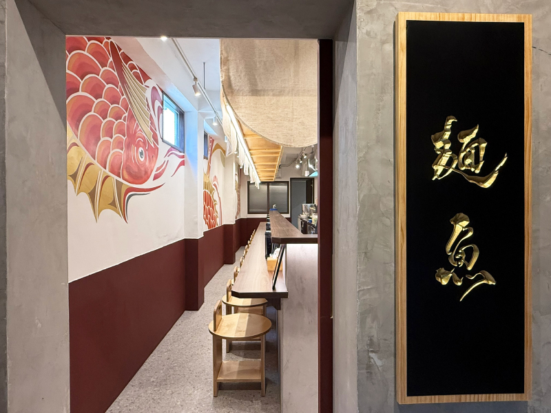 至於「麵魚」的LOGO,其以六角形幾何色塊為背景,意寓著拉麵碗的俯視或側面意象,中間有隻圓滾滾的魚,它躍動著魚鰭和尾巴從碗(海面)中跳躍而出,橋本社長表示,這象徵食材的新鮮度,以及湯頭風味的鮮活與生猛,彷彿魚群在口中跳躍一般。