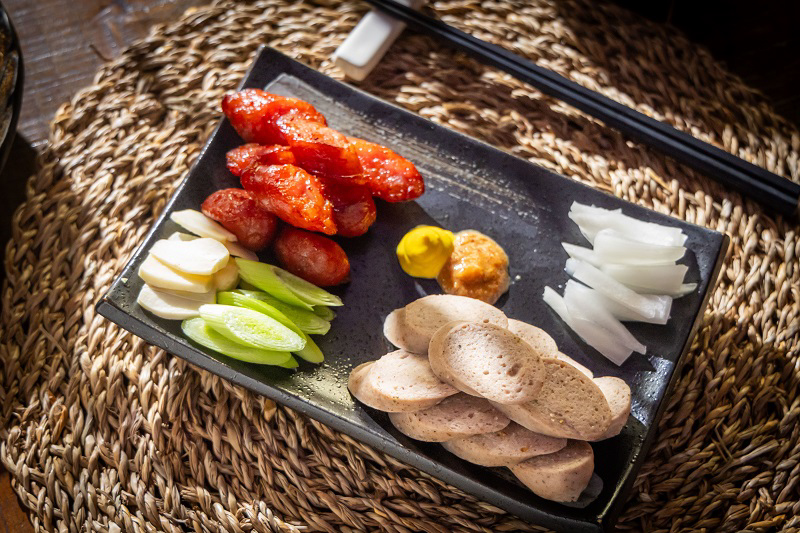 搭酒小菜,推薦經典「香腸雙拼」,有肉質厚實的台式香腸搭配美味的德國白香腸,可蘸佐Develey甜巴伐利亞芥末,兩種風味一次滿足。另一道「日式炸豆腐」將嫩豆腐裹上柴魚絲入鍋油炸,柴魚醬汁與微辣七味粉格外提味。老饕必點的「明太子軟絲」、每日限量供應的特級「鹹豬肉」,每一樣都熱銷。