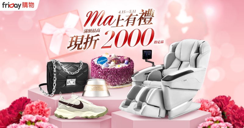 每年母親節總為要買什麼母親節禮物而傷腦筋?不如直接照著人氣清單來挑選囉!遠傳 friDay 購物將於4/15至5/11推出「Ma上有禮」專案,直接幫大家整理好最實用、也最容易被媽媽喜歡的 TOP5 禮物,從蛋糕甜點到保養、按摩一次到位,還有糕調寵愛名店59折,保養美妝3折起,快來挑一份禮物送給媽媽,滿額最高折價2,000的優惠送給自己!