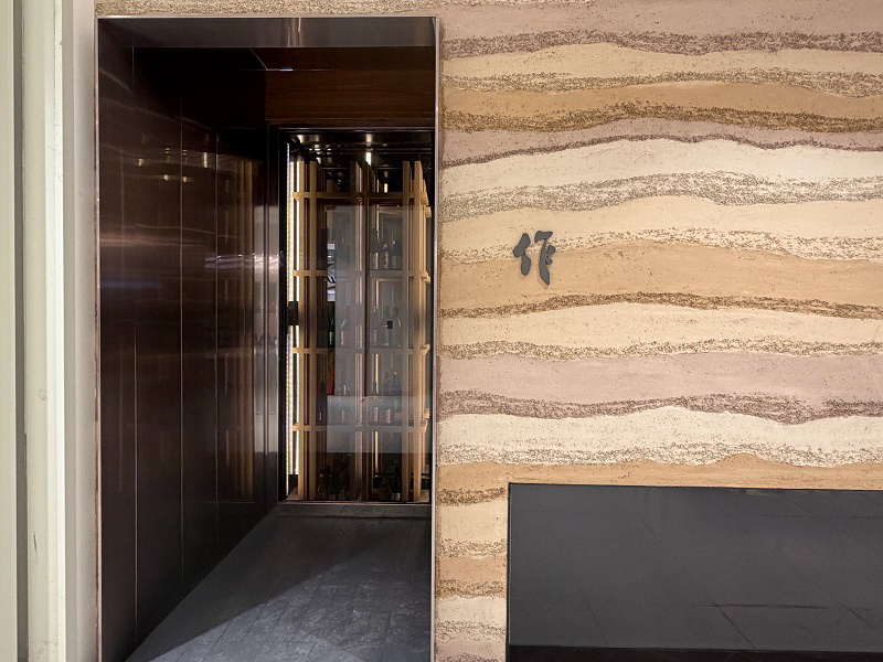 「作 天麩羅・割烹」低調的空間在門後玄關處,首見的是酒櫃,如此空間設計以減法為核心,呼應天麩羅料理本質。(圖片來源:Rene Hung)