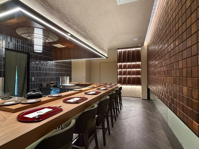 「作 天麩羅・割烹」用餐空間以16席ㄇ字型板前座位設計,結合版築壁等傳統工法,融入銅板與深色磁磚等現代材質。(圖片來源:Rene Hung)