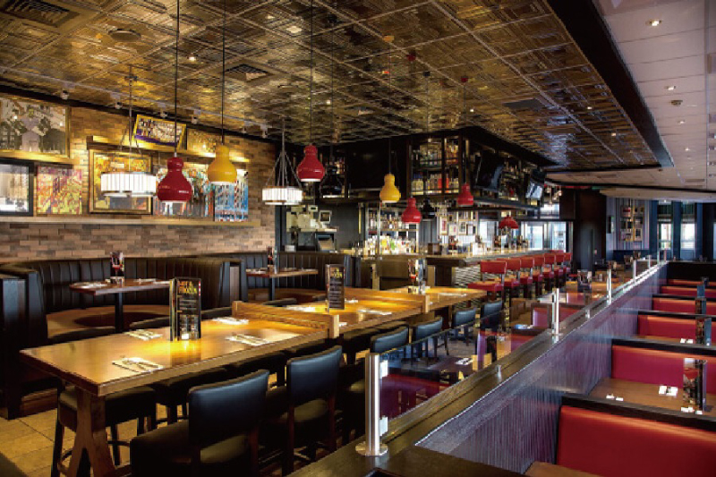 美麗華店寬敞且充滿美式復古風情的用餐空間,電視正播放著熱血賽事,氣氛熱鬧非凡。(圖片來源:TGI FRIDAYS官網)