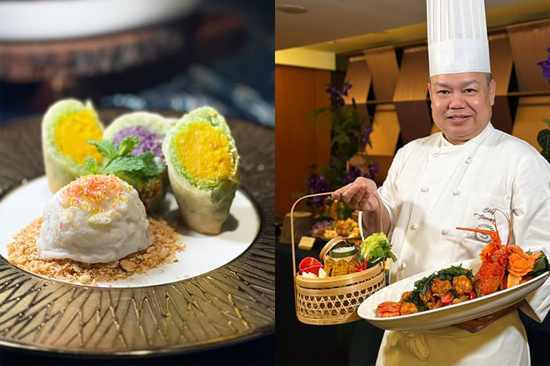 SUKHOTHAI泰式餐廳泰籍主廚Jimmy 以 “From Local to Royal” 為精神,重新詮釋泰國各地經典風味。圖左為泰式酥炸嫩米南瓜紫薯。(圖片來源:Sid)