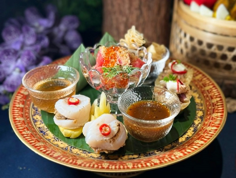 Jimmy主廚以此延伸推出「泰式皇家宮廷開胃拼盤」,因製程繁複、工序細緻,在泰國當地亦屬少見菜式,多見於高端餐廳或宮廷料理體系。拼盤集結炙燒干貝佐鳳梨、香辣豬肉金袋、泰式蒸蝦餃、蟹肉皇家金杯與西瓜佐挪威鮭魚酥,樣樣精緻,呈現鹹甜交織的宮廷風味。