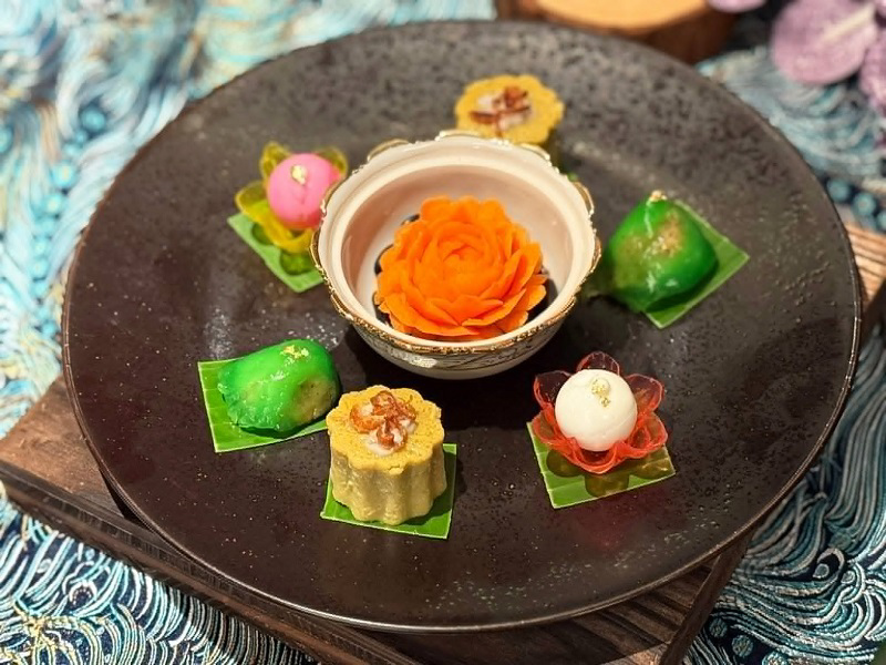 有拼盤、有肉、有海鮮料理,「暹羅宋干」饗宴自然也有甜點。合泰國各地文化與寓意的「主廚特製綜合甜點拼盤」,包含口感介於卡士達與布丁之間的「泰式黃豆糕」、以斑蘭葉米糕包裹芋泥內餡的「蒸芋頭糕」,以及以波羅蜜與椰肉製成的「椰香甜球」。其中波羅蜜在泰文中象徵「支持與助力」,寓意新年事事順遂,亦為節慶餐桌上不可或缺的甜點之一。