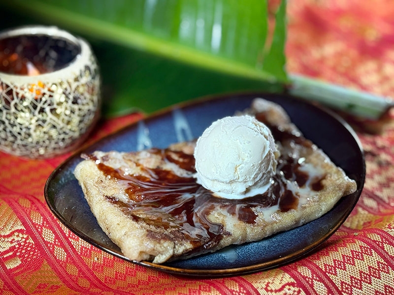 現桿餅皮包入新鮮香蕉,煎至外酥內軟,再淋上煉乳與巧克力醬,是經典泰國街頭甜點的還原再現。可以再自己DIY加入一球冰淇淋,又是另一種風味了。