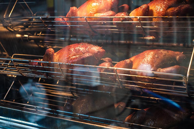 店內的烤箱裡散發出溫暖誘人的黃光,外皮油亮的烤雞們,躺在像是摩天輪的烤架上轉呀轉呀使出催眠術,吸引不少過路人的佇足。而這位穿著拖鞋的男子,就是老闆兼烤雞師吳昭毅。