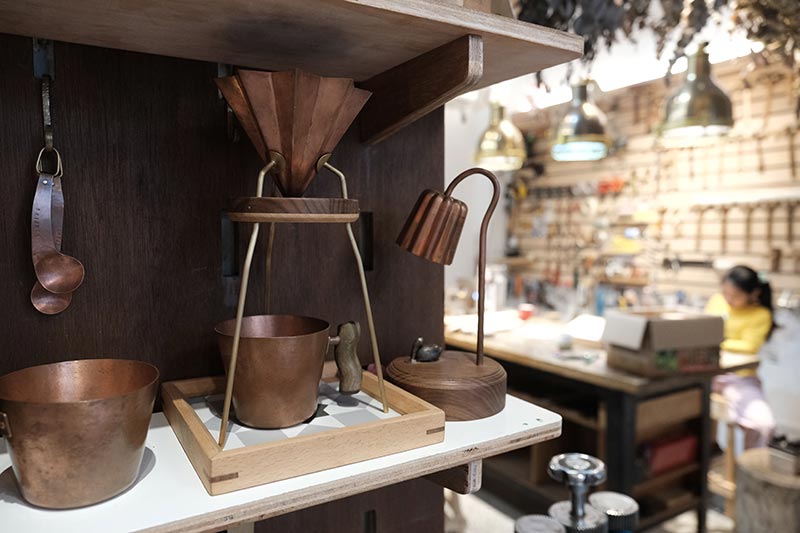 木梁作的「工頭」小朱哥,年輕時心裡就住了個木工魂。相較於一般學木工的人著重於不同木材的表現,他更擅長將木頭與金工結合,激發出更多創作靈感。「老舊的木頭搭配氧化的銅,視覺上是很和諧、舒服的」他解釋道。店內基本款的組合,是一支支用海邊撿來的漂流木為柄做成的銅湯匙,不僅環保、造型獨殊,也帶著樸實溫潤的氣息。