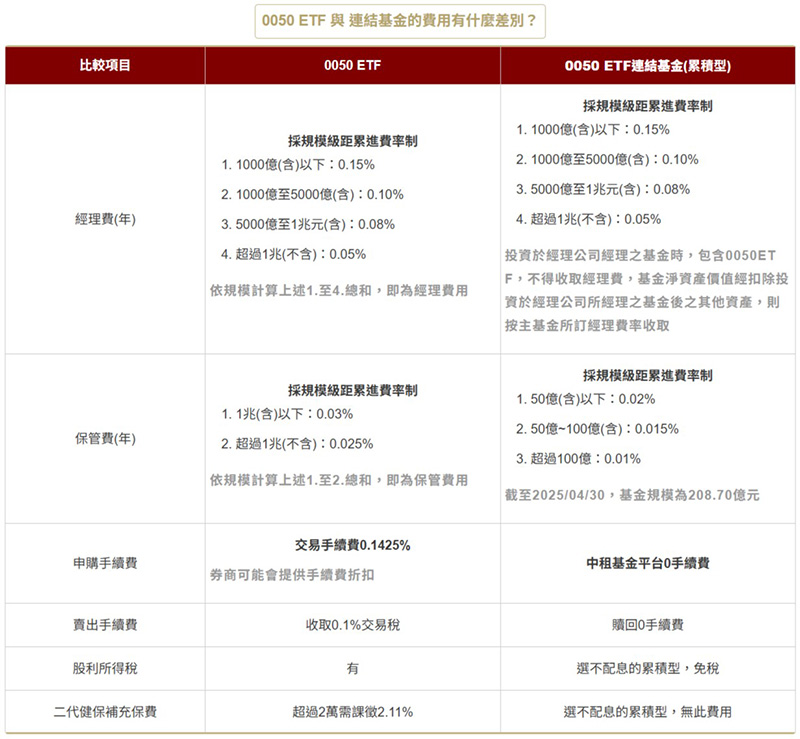 0050 ETF vs 0050 ETF連結基金,費用結構對照表