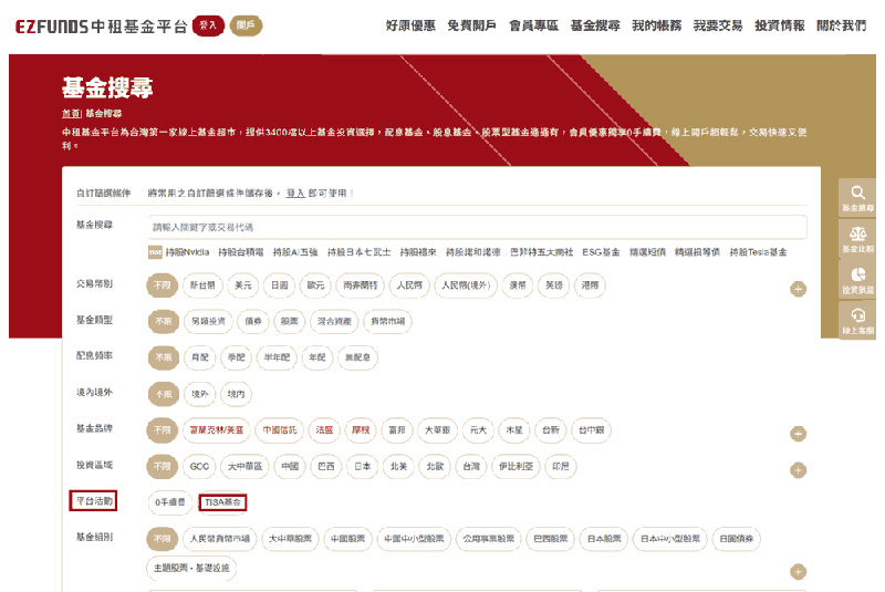 從中租基金平台首頁選單進入「基金搜尋」頁,找到「平台活動」篩選項目,點選「TISA基金」,並按下送出,網頁下方就會提供中租基金平台上的TISA基金清單。