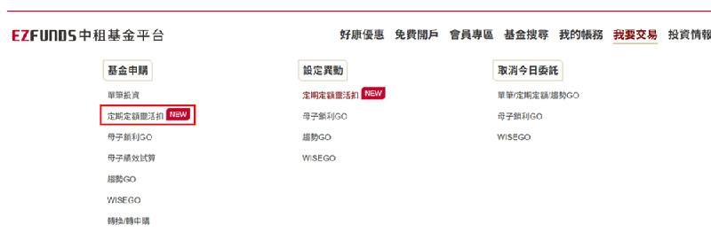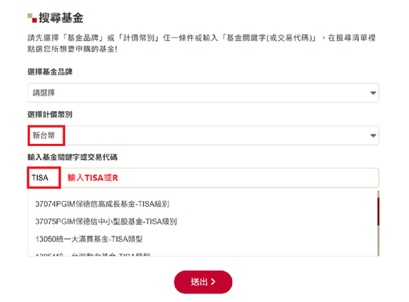 於中租基金平台官網選單,點選「我要交易/基金申購/定期定額申購」,進入基金定期定額申購流程,選擇幣別「新台幣」,並於基金名稱欄位中輸入TISA或R關鍵字,就能在下拉式選單中,快速找查到TISA級別或R級別的TISA基金。(補充說明:目前TISA基金包含好好退休準備平台境內的R級別基金,以及新增的TISA級別基金)
