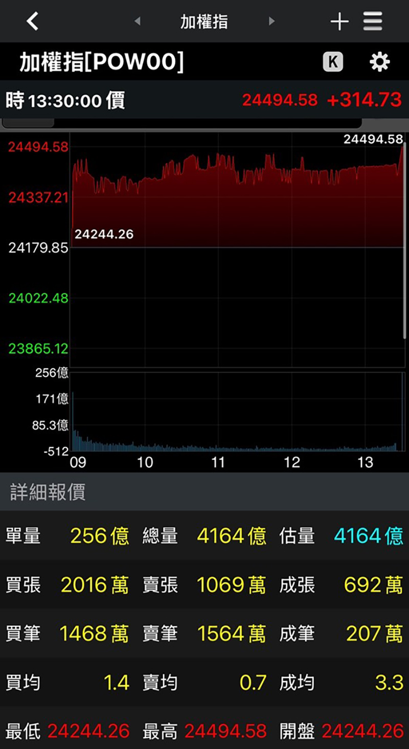 台股9月5日勁揚314點直逼24500點。(圖片來源:手機截圖)