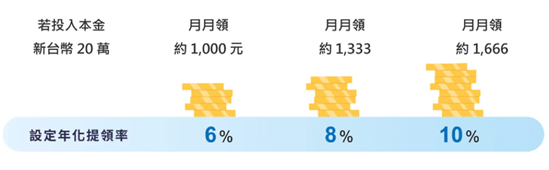資料來源:中租基金平台整理,以上僅為假設之投資方法試算,不代表實際報酬率及未來績效保證。投資人因不同時間進場,將有不同之投資績效,過去之績效亦不代表未來績效之保證。月月領的提領資金來源是根據您所設定的提領金額,系統以母基金淨值估算相對應的單位數並執行母基金的買回交易,有可能贖回本金,不同於一般的基金配息,如欲了解更多詳情請至中租母子月月領問答。