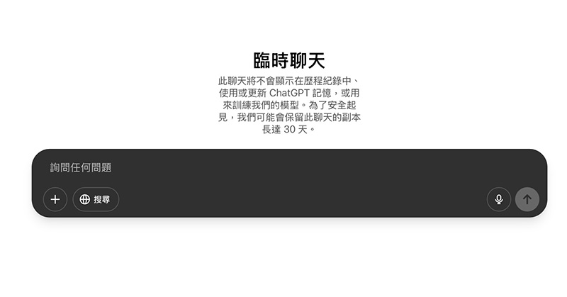 如果有重要資料要詢問,你可以開啟ChatGPT的「臨時聊天」功能,基本上這可以說是ChatGPT的「無痕模式」,聊天將不會顯示在歷程紀錄中、使用或更新ChatGPT記憶,或用來訓練模型,但為了安全起見,還是可能會保留此聊天的副本長達30天。