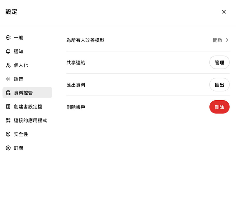 另外,ChatGPT有一個「為所有人改善模型」的功能,你可以選擇關閉,這樣就不會被用來訓練其它人的模型,另外你也能在設定中關閉參考儲存的記憶、參考聊天記錄功能,並可以刪除所有的聊天內容,減少資料意外曝光的風險。