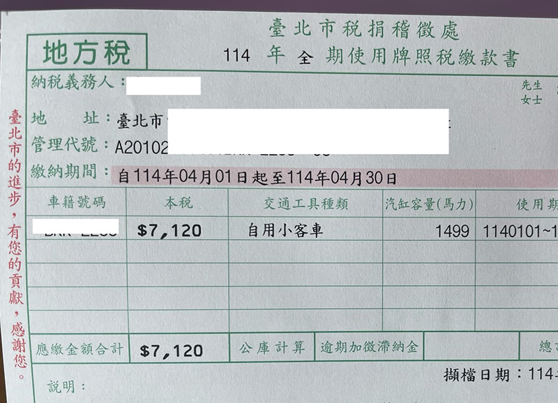 使用牌照稅將從4月1日開徵,稅單都已陸續季達到民眾家中。(圖片來源:L)