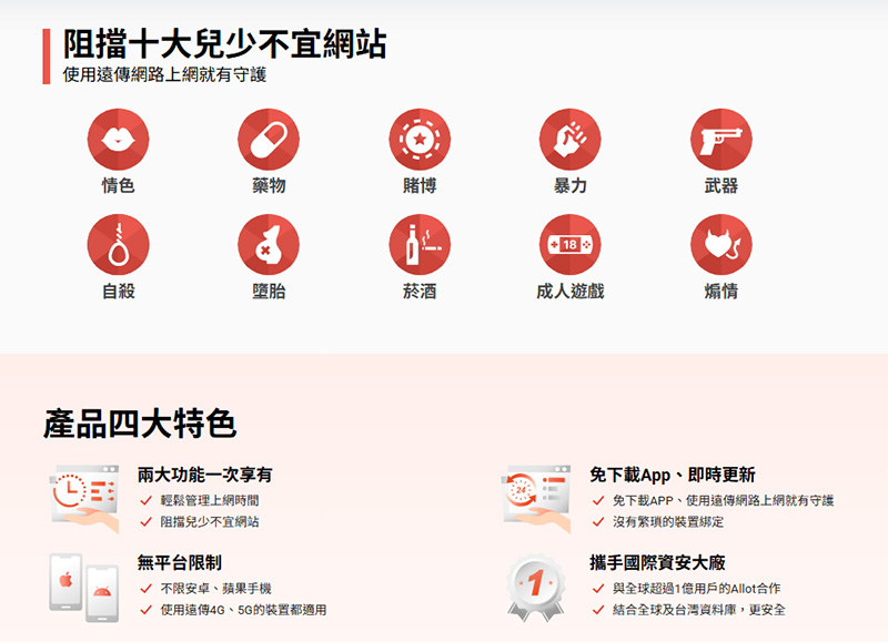 遠傳與資安大廠Allot合作推出「兒少心守護」服務,一旦偵測到孩子點進任何不宜內容,「兒少心守護」會自動擋掉。(圖片來源:遠傳FET)