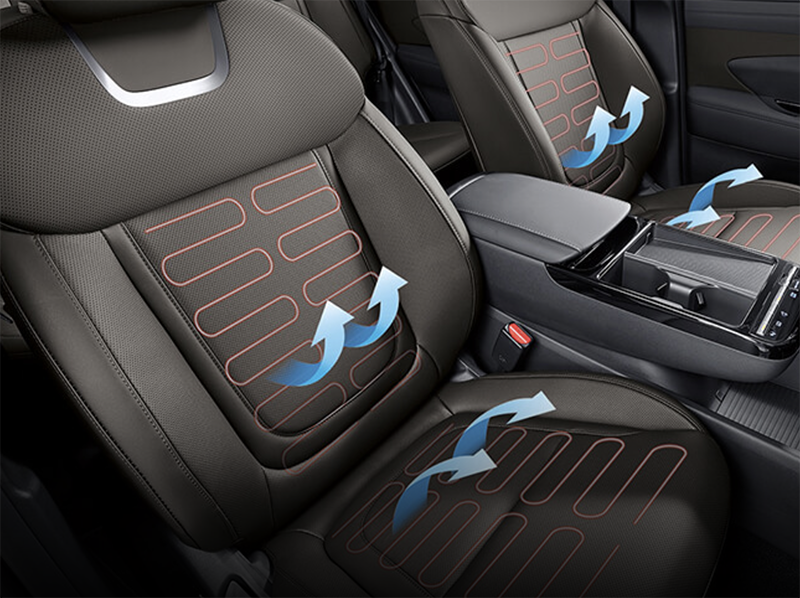 相較於Toyota與Mazda標配通風座椅的車款都是進口車,韓國的Hyundai,則在國產車型中,提供通風座椅。首先是Hyundai Tucson L Turbo-Hybrid,除了有油電渦輪動力加持,提供強勁的動力與優異的油耗,在GLTH-C車型當中將雙前座通風座椅納入標配。這使得Tucson L得以兼顧清爽乘坐體驗、省油與出色動力等需求。