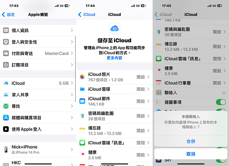 2. 如果還沒將聯絡人資料合併到iCloud,系統會詢問是否要合併,請選擇「合併」。