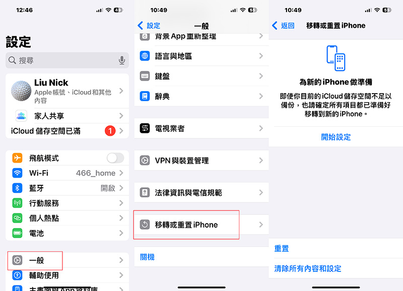 1. 「設定」→「一般」→滑至底部找到「移轉或重置iPhone」