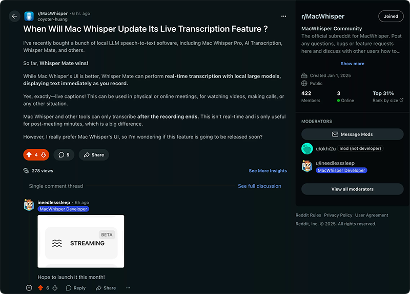 至於最多人使用的 MacWhisper 軟體,未來會不會也實現「自動即時會議記錄」功能呢?我親自去 Reddit 詢問,得到的答案是肯定的:
