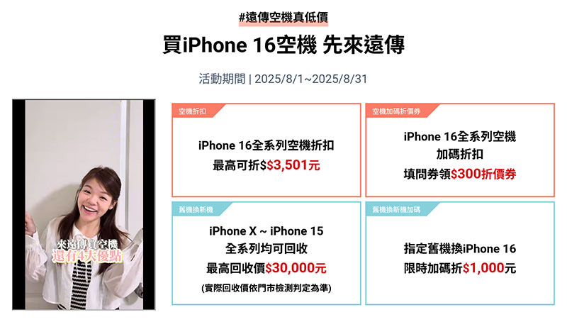 以遠傳電信為例,最新一期活動iPhone 16全系列空機最高可折3,501元,如果有填問卷可再折300元。舊換新的話最高回收價為30,000元,指定機種換iPhone 16加碼折1,000元。除了價格上的直接折扣,也會有信用卡分期0利率、無卡分期手續費優惠、遠傳幣回饋等優惠。另外還會送friDay影音1個月、Spotify Premium 3個月、30G 5G上網流量包、防駭守護3個月等數位加值服務。