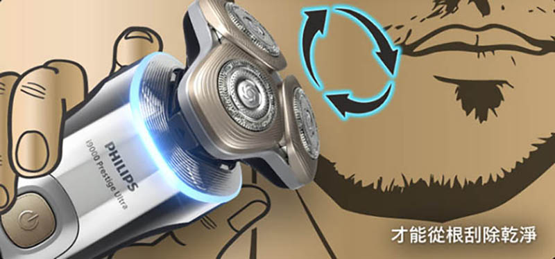 旋轉式電動刮鬍刀以單個或三個圓形刀頭組成,可輕柔順著臉部曲線滑動,偏向鬍鬚細軟、數量較少的人使用。圖為Philips飛利浦旗艦旋護式電動刮鬍刀XP9404/31。(圖片來源:遠傳friDay購物)